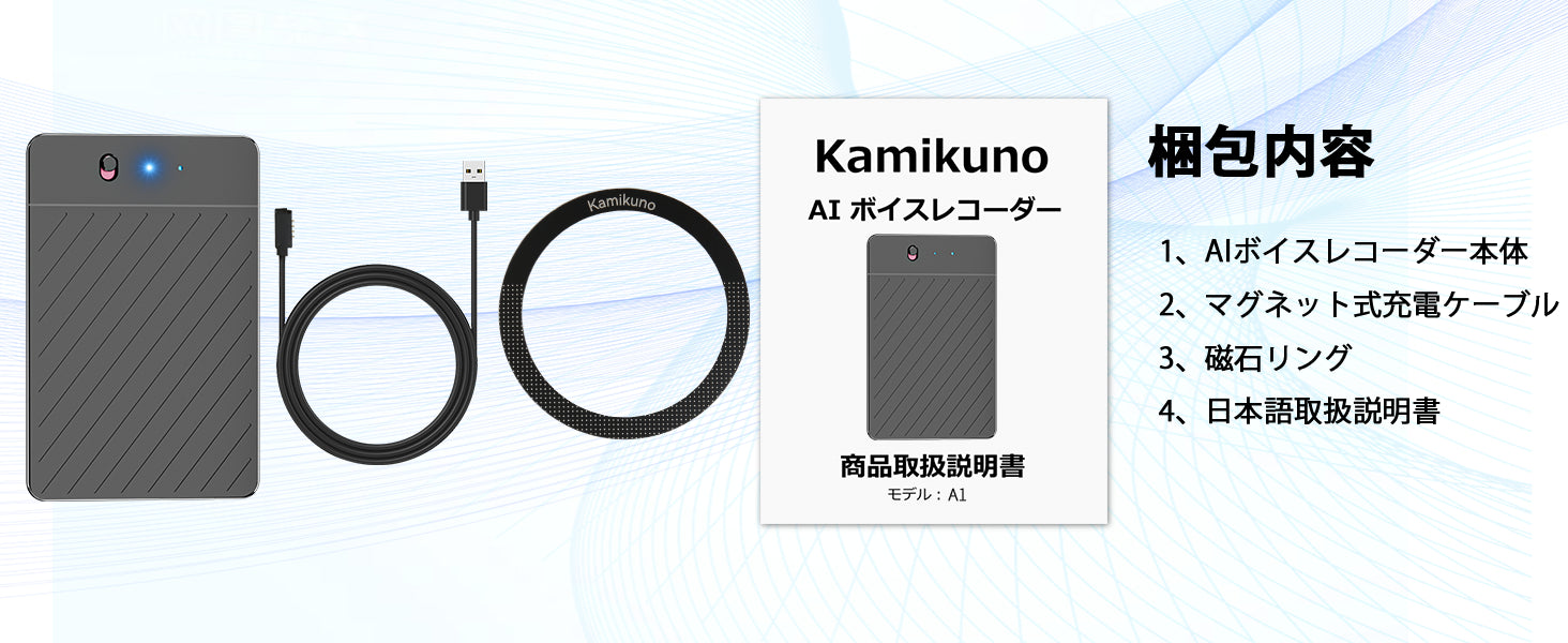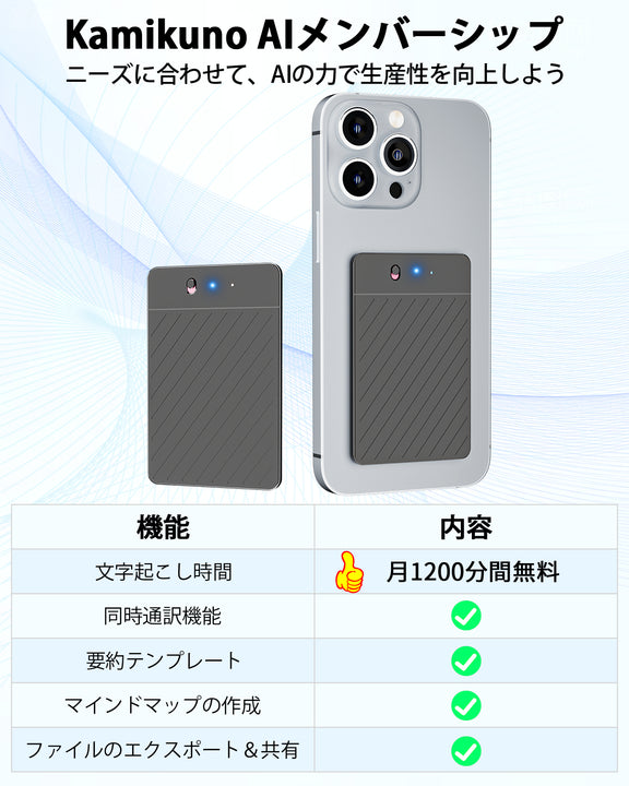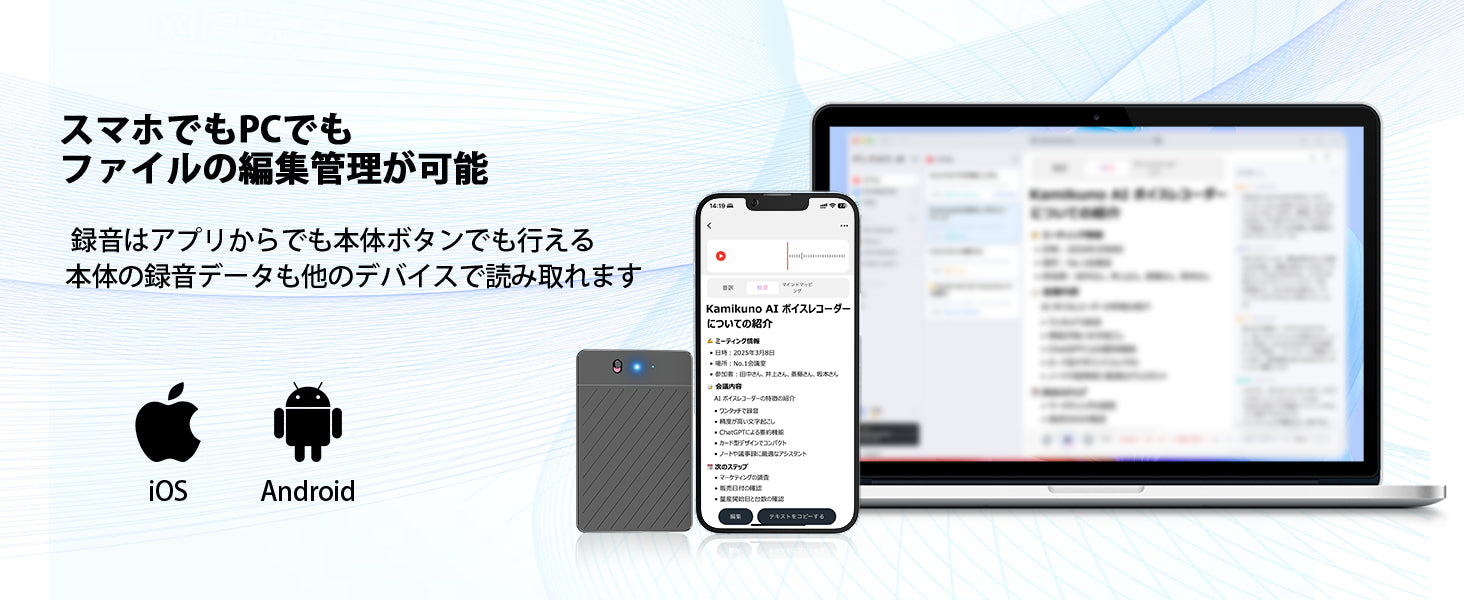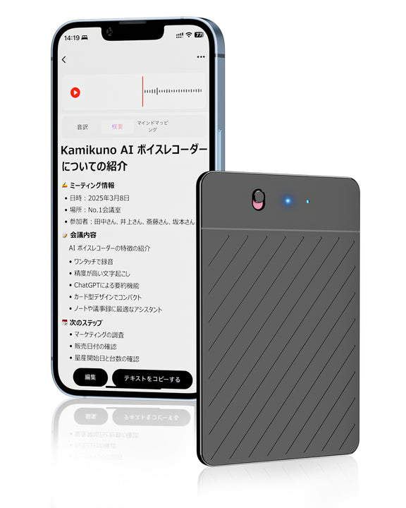 Kamikuno AI ボイスレコーダーはOpenAIの「Whisper」を採用し、専用のアプリ「AIREC」を活用して録音した音声をスマートフォンに取り込むことにより、文字起こしをすることができます。重要な情報を一語一句逃さず、精度の高い文字起こしが可能です。ボイスレコーダー 文字起こしでは、ChatGPTが活用されており、自動で録音データのタイトルや要約を作成することが可能です。長時間の会議や電話など、確認するのに時間のかかる内容でも、ChatGPTが瞬時に要約してくれるので、時短で分かりやすい内容のまま保存できます。また、誰かが議事録を作成する必要もなくなったり、議論後はすぐに議事録を共有できたりするので、仕事の作業効率を大幅に上げます。
