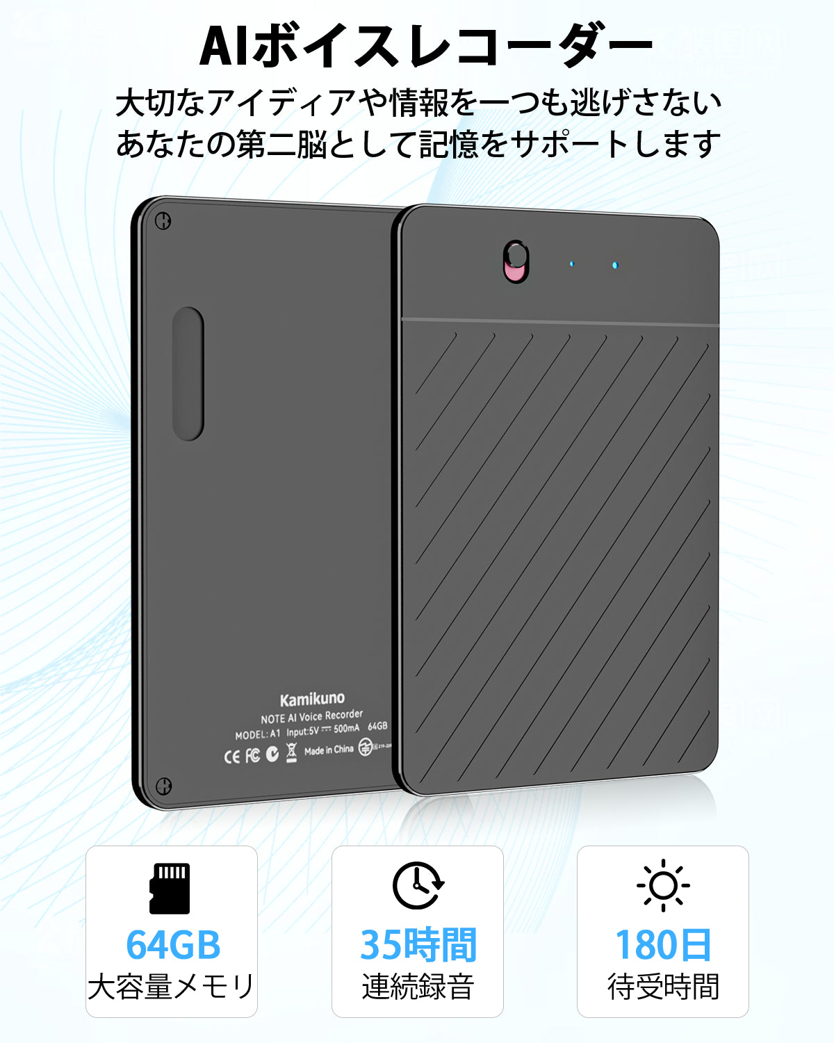 bluetooth ボイスレコーダーは、内蔵メモリが64GBと大容量のため、長時間の録音も余裕で超長時間の会議に最適です。毎日3時間録音したとしても最大360日分記録できます。また、本体サイズが小さいため、圧迫感がないので、面談や面接などの録音にも適しています。ボイスレコーダー 自動文字起こしは500mAhのバッテリーを内蔵していますので最大35時間の連続録音が可能で、待受は180日間となります。<br>