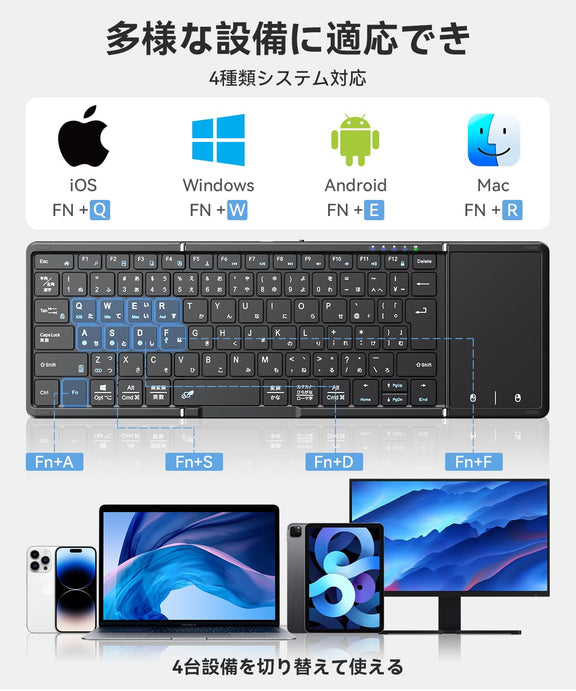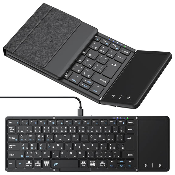 ワイヤレス キーボード は三つ折り式で出張や外回り場合は持ち運びやすくて、少し空き時間にメールの返信や文章の作成を効率的に行えます。また、ポインターを自由に操作できる大型タッチパッドを搭載し、スマートフォンやタブレットを効率的に操作できます。
