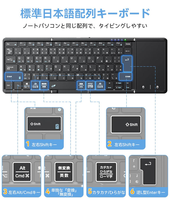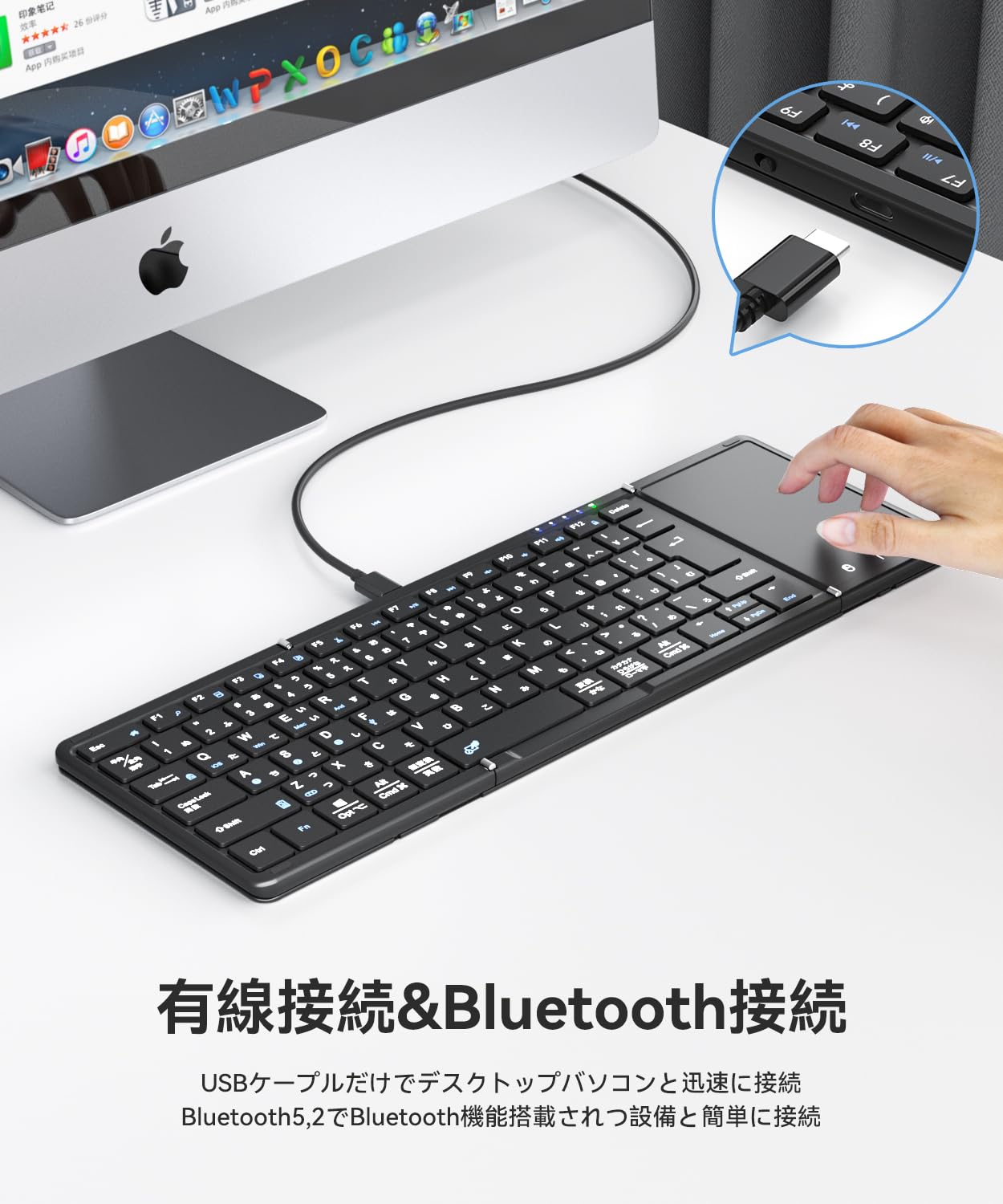 【最新型】Omikamo キーボード ワイヤレス 折り畳み式 ipadキーボード Bluetooth タッチパッド付き 日本語配列 有線&無線両用 左右Shiftキー/L型Enterキー搭載 4台デバイス切替 Android/Win/Mac/iOS/Google対応 パソコン コンパクト静音 軽量 薄型 日本語説明書付(黒)